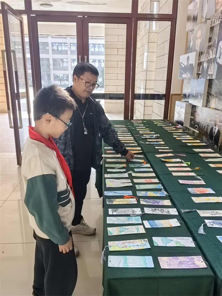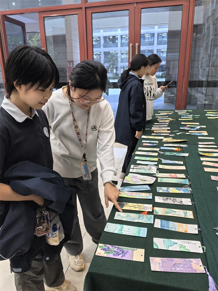 “这张书签上画的是天安门,旁边还写着‘我爱你中国’,太有创意了!”“用水墨画展现了长城的雄伟,还题了诗,真是厉害!”14日中午,八年级一楼人头攒动,一场别开生面的手绘书签展览吸引众多师生驻足。展台上,一枚枚制作精美的染色书签整齐陈列,每一件作品都是学生用心创作的结晶。