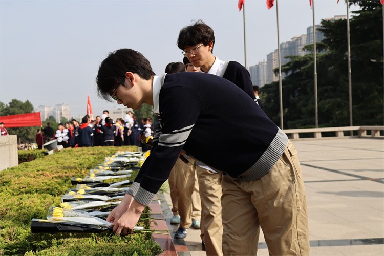 接下来,同学们手持素菊,依次缓步走向纪念碑。他们在碑前驻足凝望,俯身将菊花轻轻安放,细细整理花束,以最朴素而庄重的仪式,将心中的敬仰与追思献给长眠于此的英雄先烈。一朵朵菊花,承载着青春的敬意;一次次俯身,传递着信仰的接力。