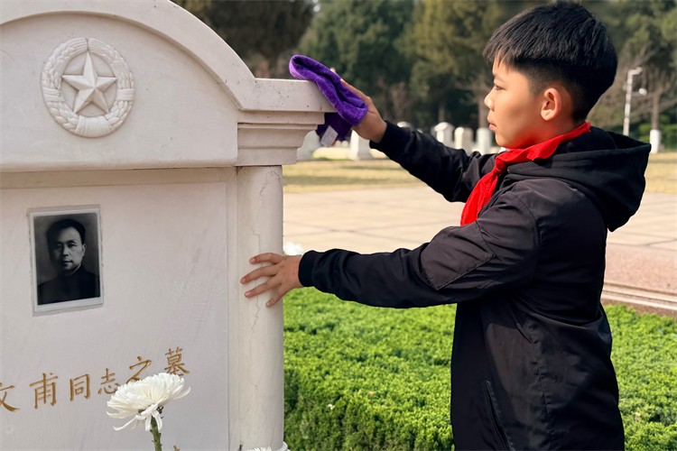 同学们为烈士墓碑拭去灰尘