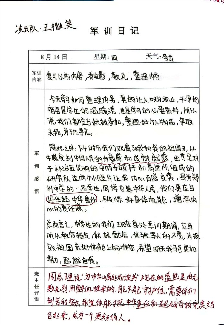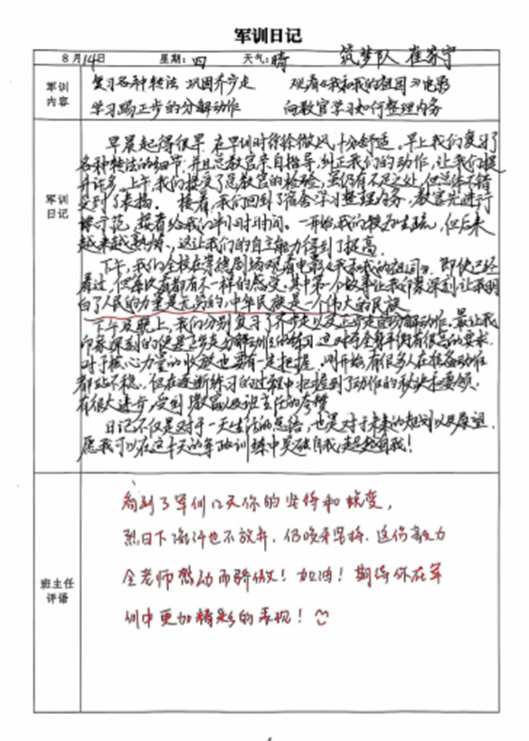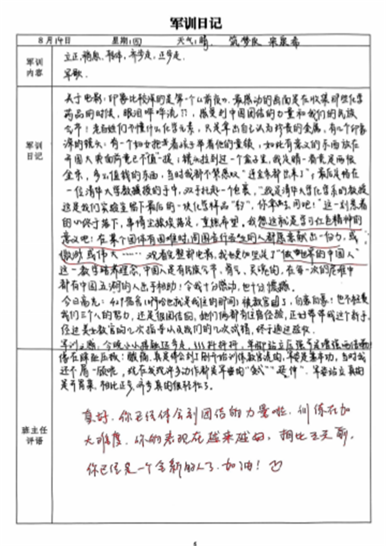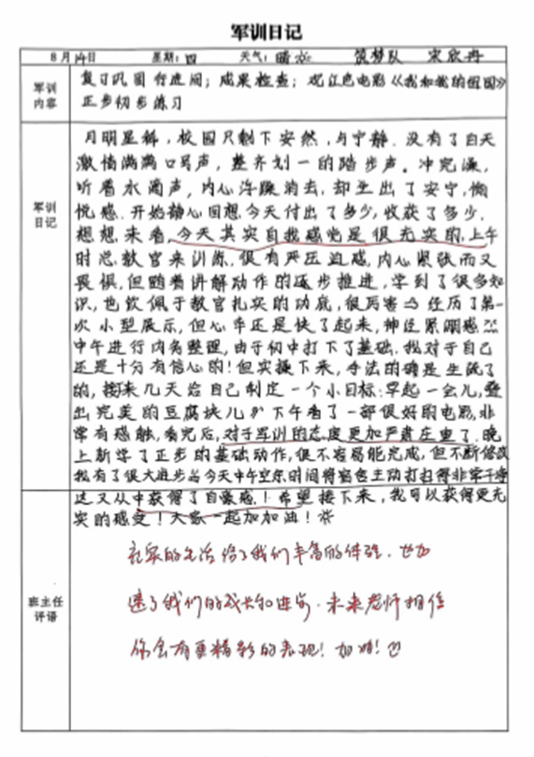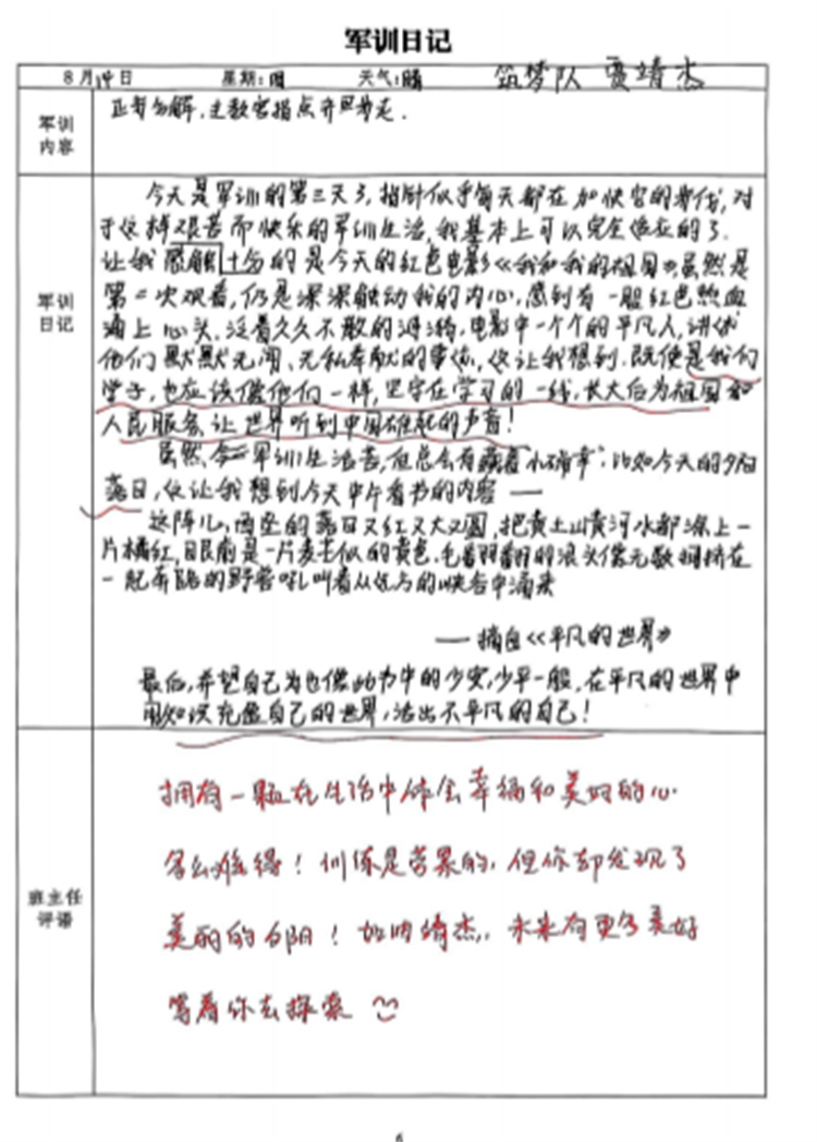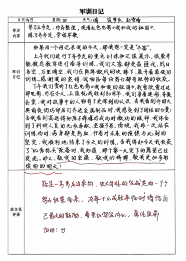 军训日记,恰似时光的容器,承载着学生的各种心绪,记录着他们最真实的感受。当笔尖划过纸页,写下的不仅仅是文字,更是骨骼与骄阳碰撞的回响。这本被汗水浸透的日记,记着你咬紧牙关时颤抖的腿骨,记着你在教官厉喝中猛然绷直的肩线,更记着那些从指尖滴落却蒸发成星火的倔强。正握笔书写迷彩年华的你——将那些混着盐粒的哽咽、观看电影时的感动、掌握又快又好整理内务的技能的骄傲……统统封存进这页时光胶囊。多年后再度掀开,每一道笔迹都会咆哮着复活——“看啊!这就是我横平竖直的成长!”