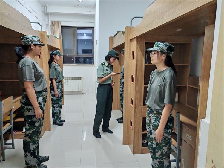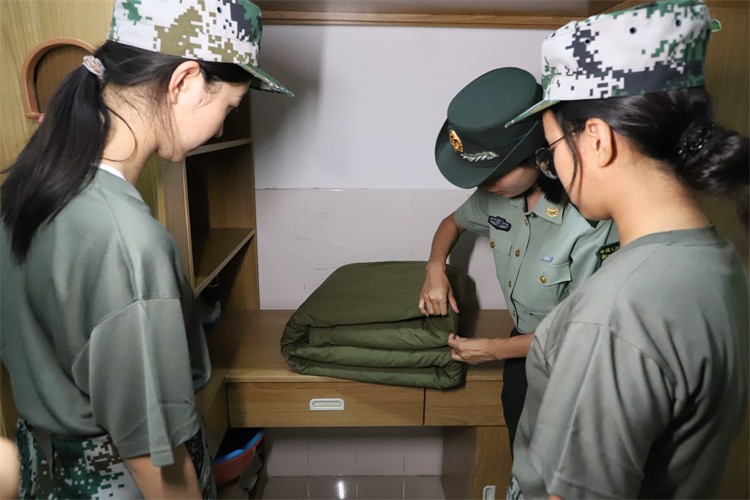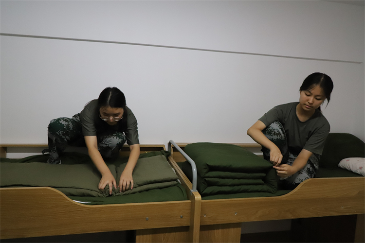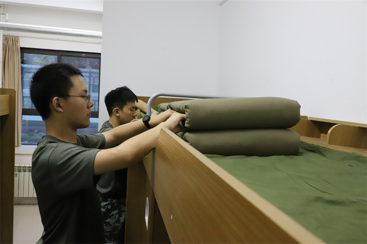 五指并拢压平褶皱,三折四叠捏出锋芒。教官手中翻飞的棉被化作棱角分明的“豆腐块”。在认真观摩后,学子们用指尖在棉被上精准丈量,让对折如刀裁般利落,卷边似钢尺般平直。平日里训练场上的汗水,在此刻凝结为指尖的沉稳与极致的追求。